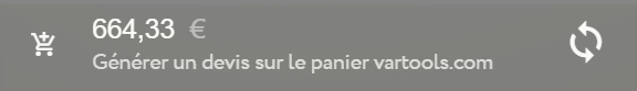 Le montant indiqué est en TTC . Ce montant ne prend pas en compte les remises. En cliquant sur ce bouton vous basculerez tous les articles présents dans le panier du site vartools.com afin de réaliser un devis ou valider la commande. Le prix indiqué sur le site vartools.com est toujours correct. Lorsqu'un meuble est placé dans l'atelier, en cliquant dessus il devient orange.